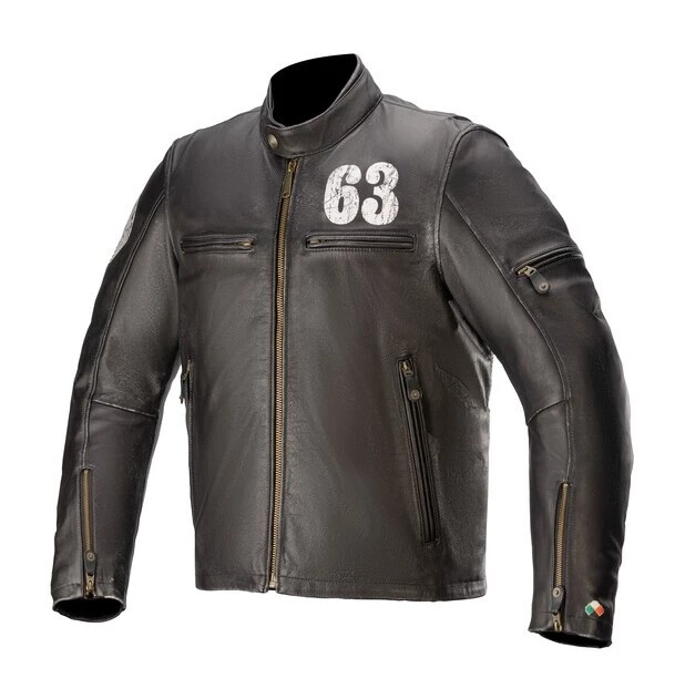 1963: The birth year of the company from Asolo that started with a boot. The classic Sixty-Three jacket celebrates Alpinestars’ birth year in style. The jacket uses premium bovine leather and elegantly incorporates Nucleon Flex Plus armor on the shoulders and elbows. Internal panels of aramidic reinforcement line these same areas for modern levels of abrasion protection. Burnished hardware, oversized leather zipper pulls and distressed branding add continuity to the throw-back inspiration.Â