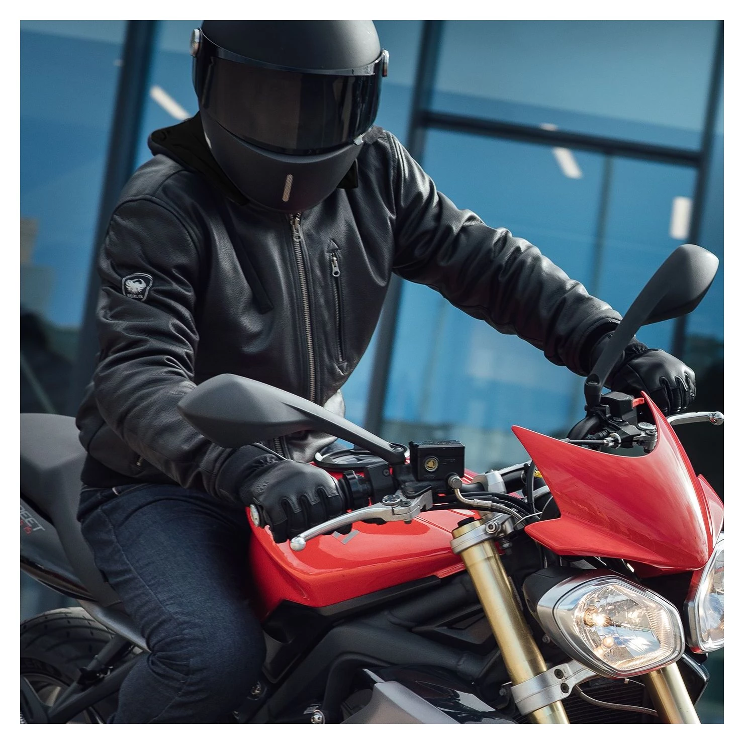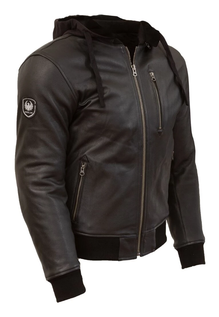 The Merlin Trance is a traditional bomber jacket disguised as sleek leather hoody. The full leather body uses premium cowhide lined with black cotton – spec’d with warmer weather riding in mind. Heavier gauge cotton is used for the removable hood. Finally, cotton makes one final appearance at the plush, elasticated cuffs and hem to create the body hugging feel that defines a good bomber. An embroidered Merlin badge is found at the bicep, right between the included shoulder and elbow impact armor.Â
