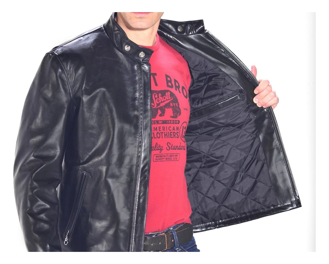 The most popular silhouette Schott offers, the 641 Jacket features a bi-swing back, adjustable stand-up collar and underarm gussets. The zippered chest and hand warmer pockets and fixed quilted liner are meant to keep the wind out and maximize range of temperature control. Constructed from deluxe, heavy horse hide for durability.