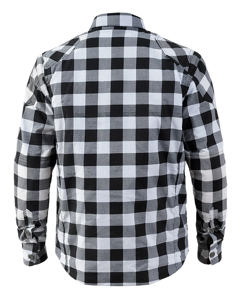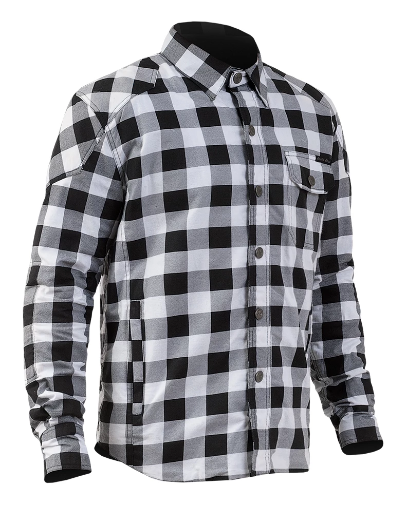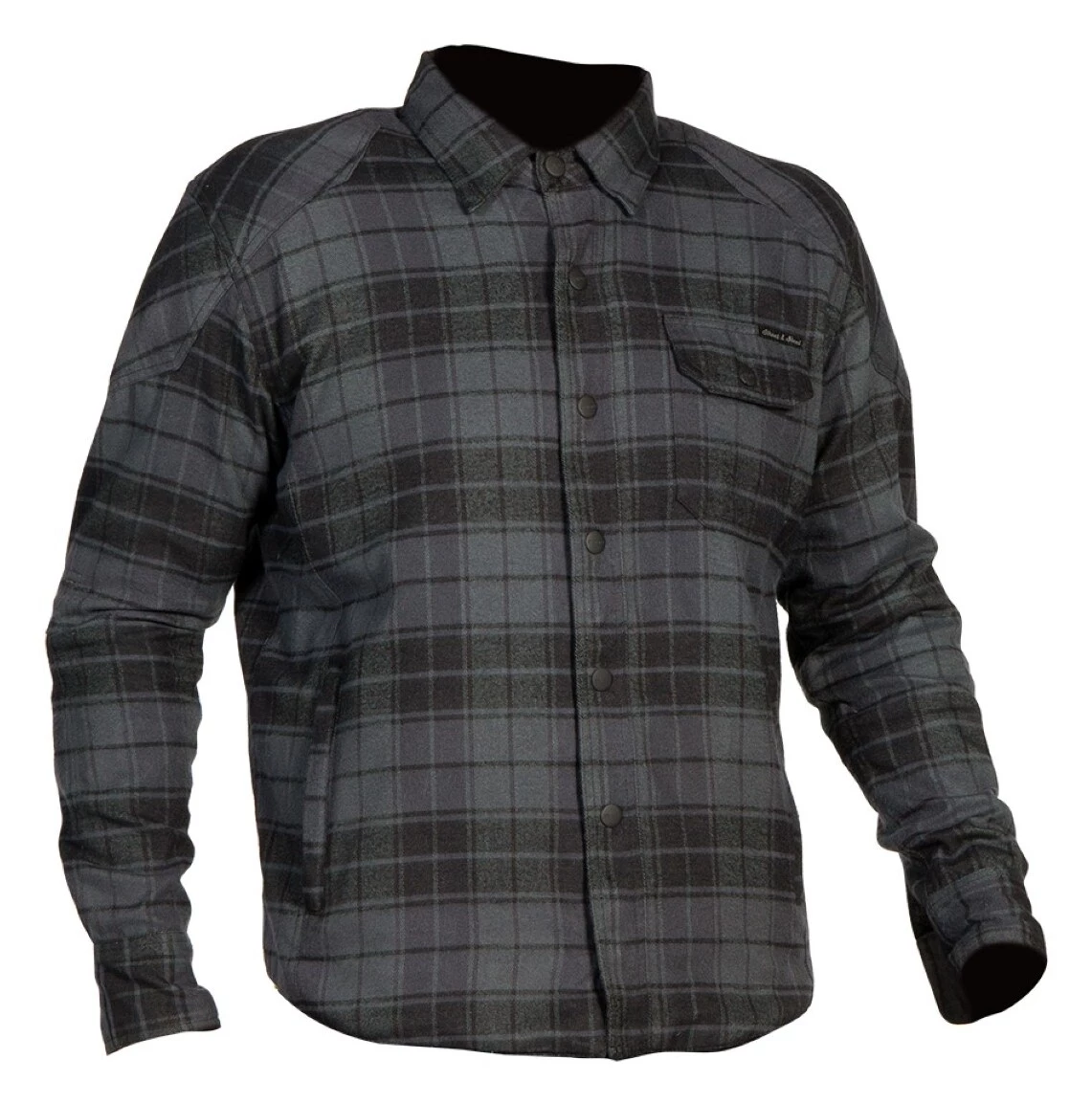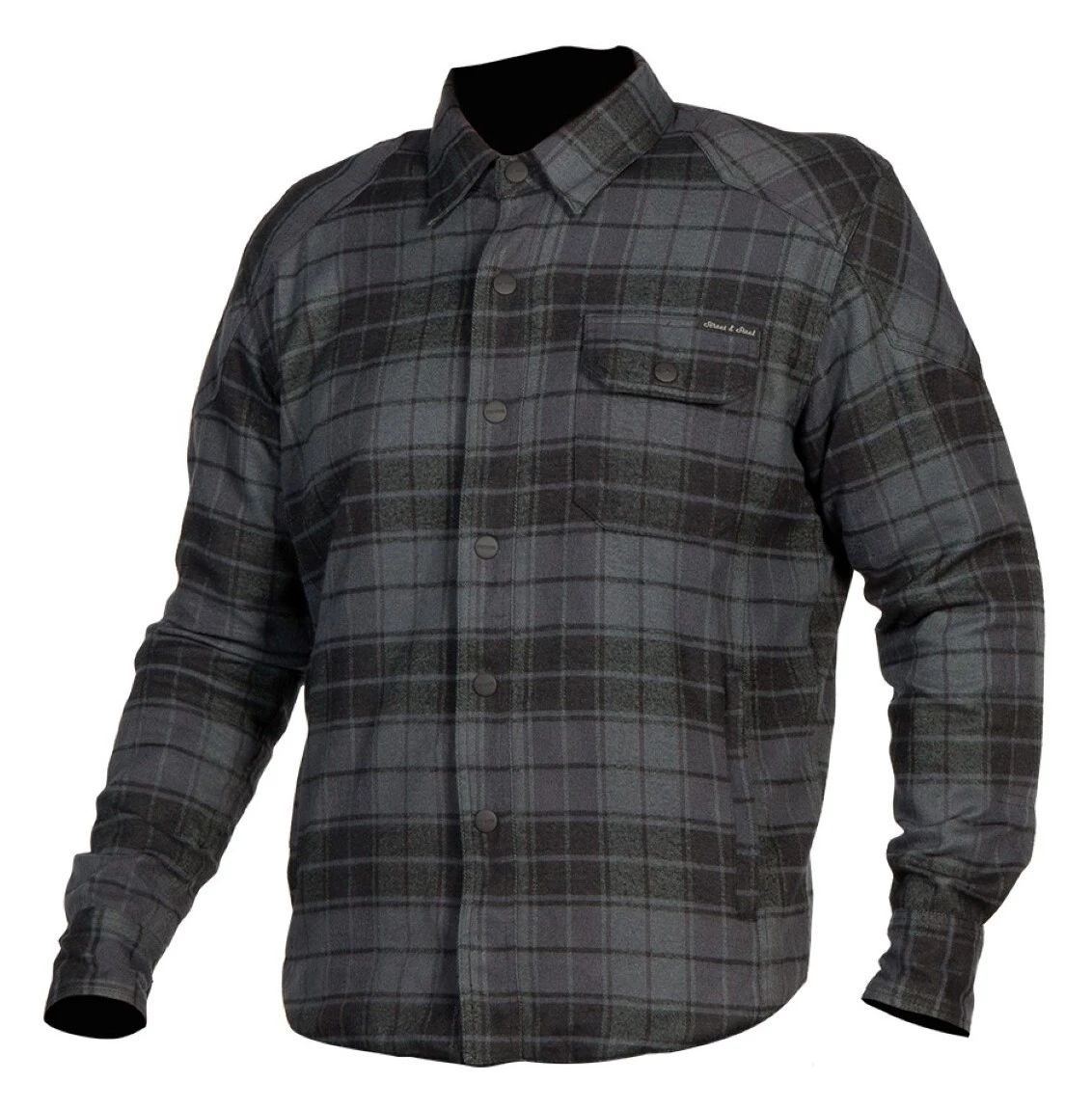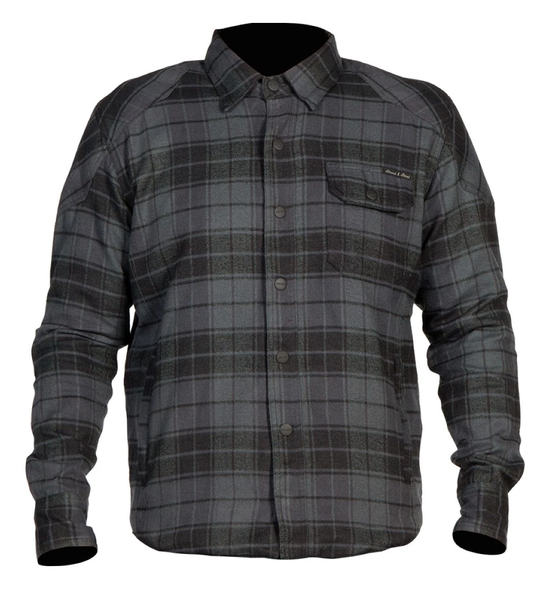 The Street & Steel Mission is an armored shirt constructed from a heavyweight cotton. Armor in the shoulders and elbows is removable. The center zipper is hidden behind a flap that snaps closed.