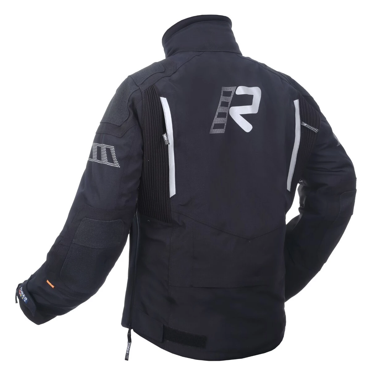 The Rukka Shield-R Jacket is packed with features to keep riders protected all around from road and weather. Breathable and waterproof Gore-Tex Pro 3 layer is laminated to abrasion and tear resistant Cordura shell fabric with Armacor and Keprotec reinforcements on shoulders and elbows. The Shield-R comes complete with D3O Air XTR shoulder, elbow and back protectors along with D3O CP1 full chest protector to fully protect the rider. Ventilation areas on back, sides, chest and sleeves ensure even airflow all throughout the jacket. Two lower front pockets and a large lower back pocket allow riders to securely store mobile devices, valuables and extra layers. A transparent card pocket on sleeves provides a place for licenses and medical cards. Adjustable waist belt, hem and sleeve ends allow riders to seal themselves off from the elements.