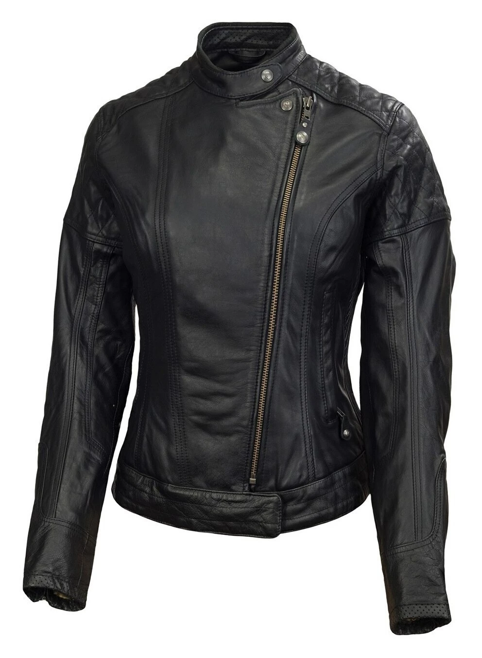 The Riot is for the ladies who are ready to cause a disturbance. A rocker jacket built for her that looks just as good on the bike as it does off the bike. Made of premium Blackstone top grain cowhide that is soft and supple the Riot is durable and abrasion resistant. The asymmetrical front zipper screams style and the quilted stitch accents bring just the right amount of femininity to this vintage styled café jacket.