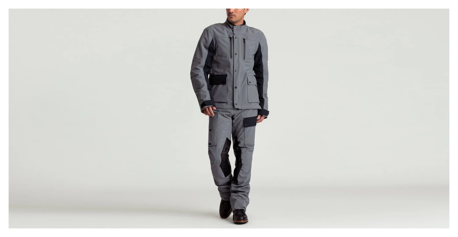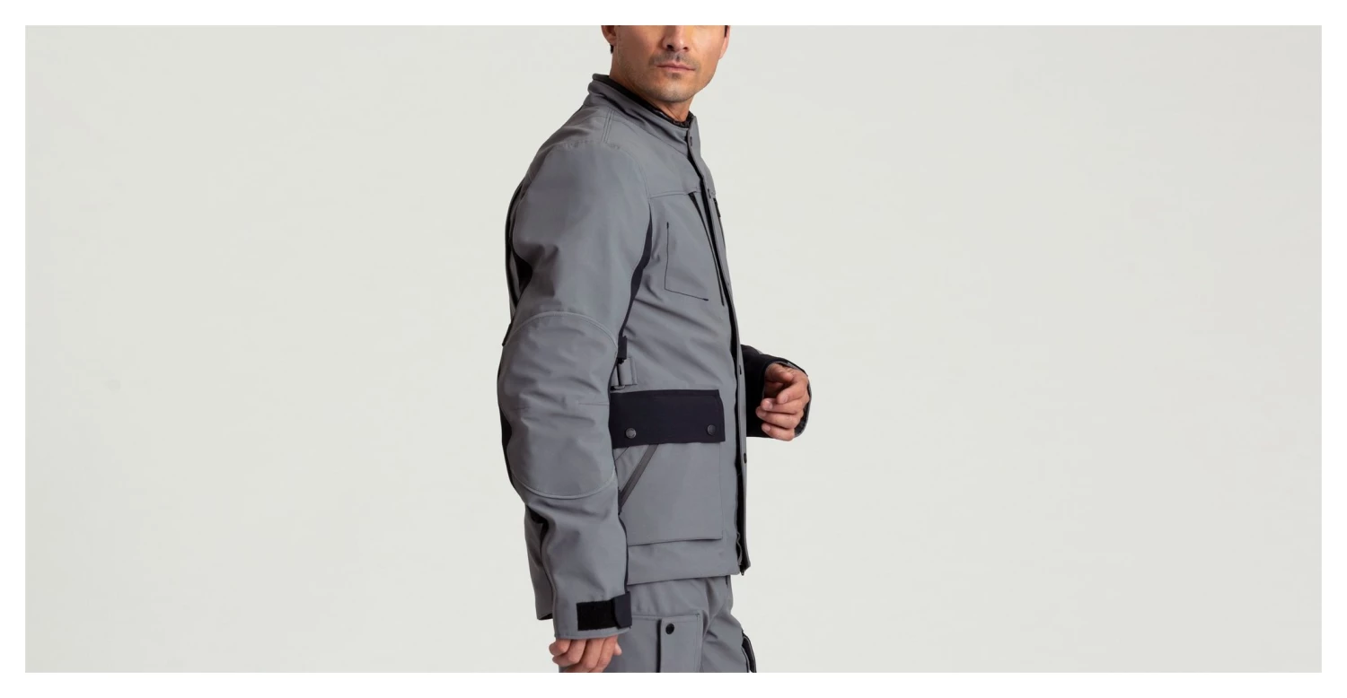 A two-way front zipper on the Divide Jacket allows the wearer to adjust the bottom hem while seated. In an effort to think of everything, branded snaps with thumb loops on the front placket enable the rider to easily close the jacket with one hand, gloves on or not. In case you encounter a rainstorm, the jacket features an interior gaiter at the neck that can be cinched down to prevent water from getting in. There is also lamb-leather detailing at the neck opening for additional comfort. The Divide Motorcycle Jacket also features plenty of storage options, including chest, hand, and patch pockets with weatherproof zippers, as well as an interior zippered pocket. The Divide Jacket is equipped with pads featuring D3O technology at the chest, elbow, shoulder, and back, all of which are CE-certified and completely removable. For maximum comfort, the elbow pockets are adjustable. Adjustable VELCRO® brand tabs at the bicep, forearm, and waist allow the jacket to be cinched down for a slim fit or loosened when cold temps call for extra layers. Additionally, VELCRO® cuffs can be adjusted to accommodate gloves, and a wind-cuff detail at the sleeve opening helps keep the elements out. Finally, a cinch at the bottom opening of the jacket allows the rider to customize the fit. Designed in tandem with the Divide Motorcycle Pant, a zipper attachment allows the two pieces to be worn together as a full body suit.