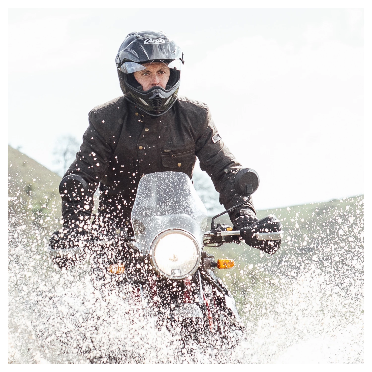 The Merlin Monty Jacket continues the tradition of the four pocket trials jacket and adds protection afforded by 12oz Halley Stevensons Scottish Silkwax Cotton technology. Featuring a zip out Reissa membrane and 125g thermal liner, the Monty will surely keep you warm and dry on every adventure. A full suite of D3O armor helps keep you protected, while the antique snaps provide stylistic accenting.