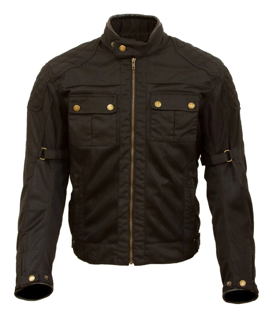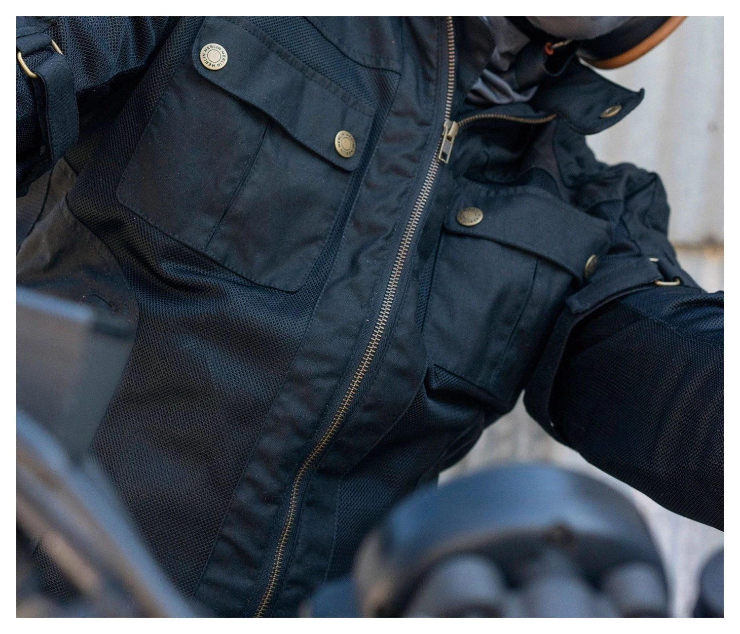 The Merlin Shenstone Air D3O Jacket is “the” jacket that cafe fans have long awaited. Now, finally, riders can benefit from large panels of air-flowing perforated mesh in a jacket that matches their TT style. The Shenstone Jacket  takes traditional one step further by honoring its English roots with genuine Halley Stevensons Cotec fabric in the jacket’s abrasion-resistant chassis. The D30 LP1 shoulder and elbow armor even boasts its own perforation to help take the high temp edge off. Merlin goes the extra step to include a D30 Viper Stealth back protector, as well. When rain or cooler temperatures prevail, install the Reissa liner for water and wind protection. Air cooled bikes run hot. You don’t have to.Â