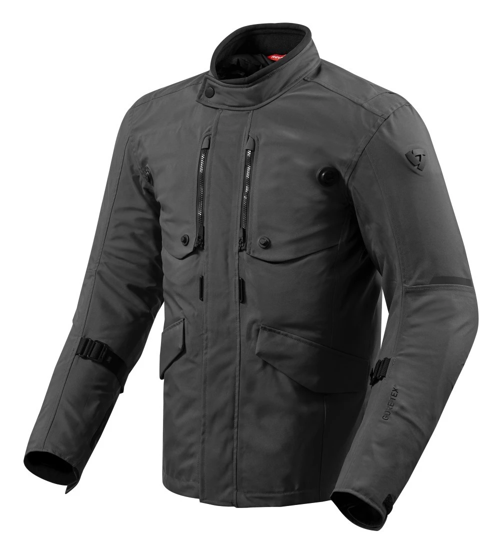 The REV’IT Trench GTX Jacket is urban styling merged with touring functionality. Subdued styling looks good off the bike while Gore-Tex, a removable thermal liner and chest vents allow it to tour for miles in a multitude of weather conditions. Gore-Tex laminated directly into the shell provides breathable waterproofing for rainy commutes and tours. A removable thermal liner helps manage a wide temperature range when paired with REV’IT’s patented VCS aquadefence ventilation system that flows air or seals out precipitation when needed. CE Level 2 armor at the elbows and shoulders are provided from the factory with the option to add in chest and back armor to complete the impact protection.