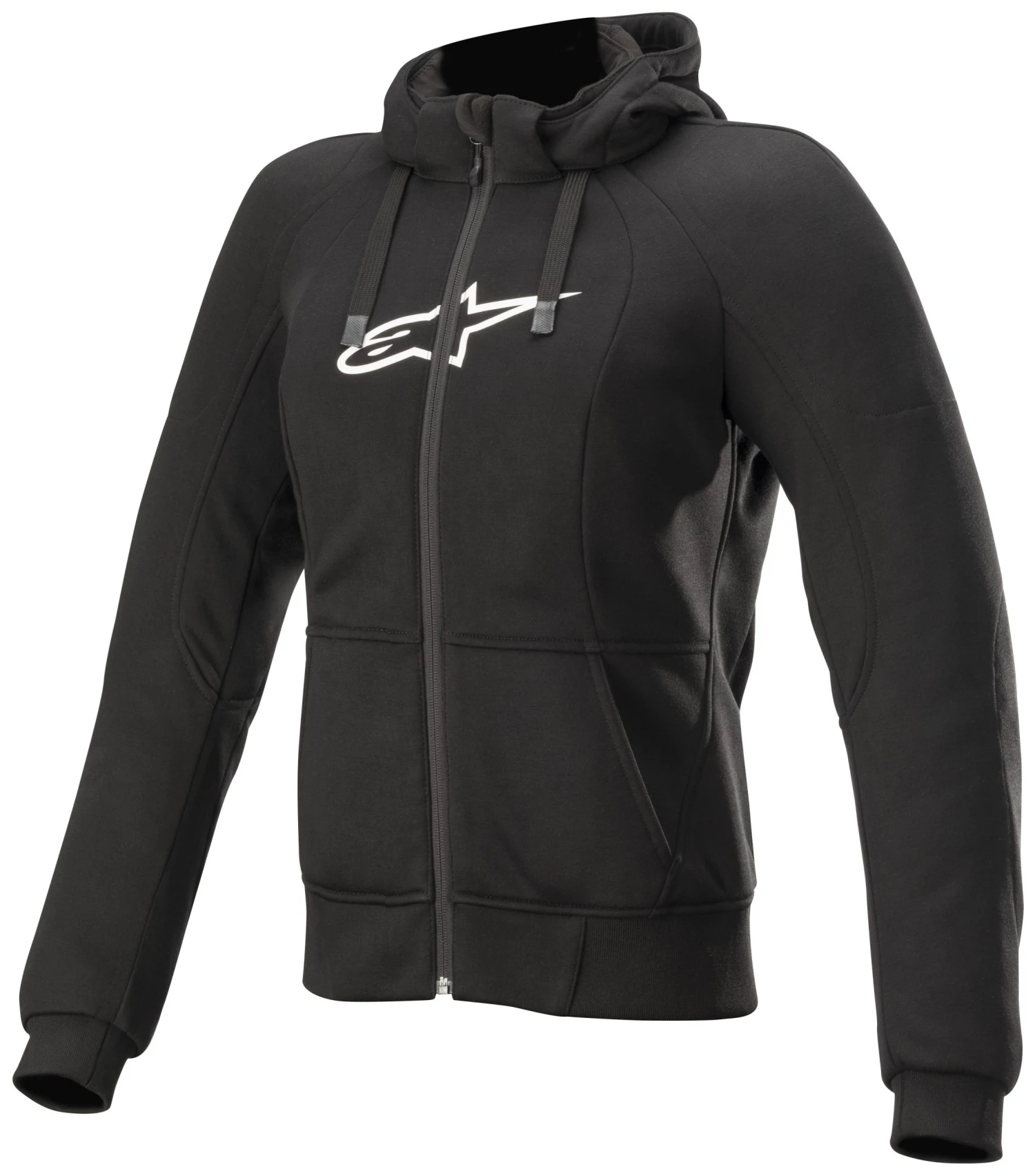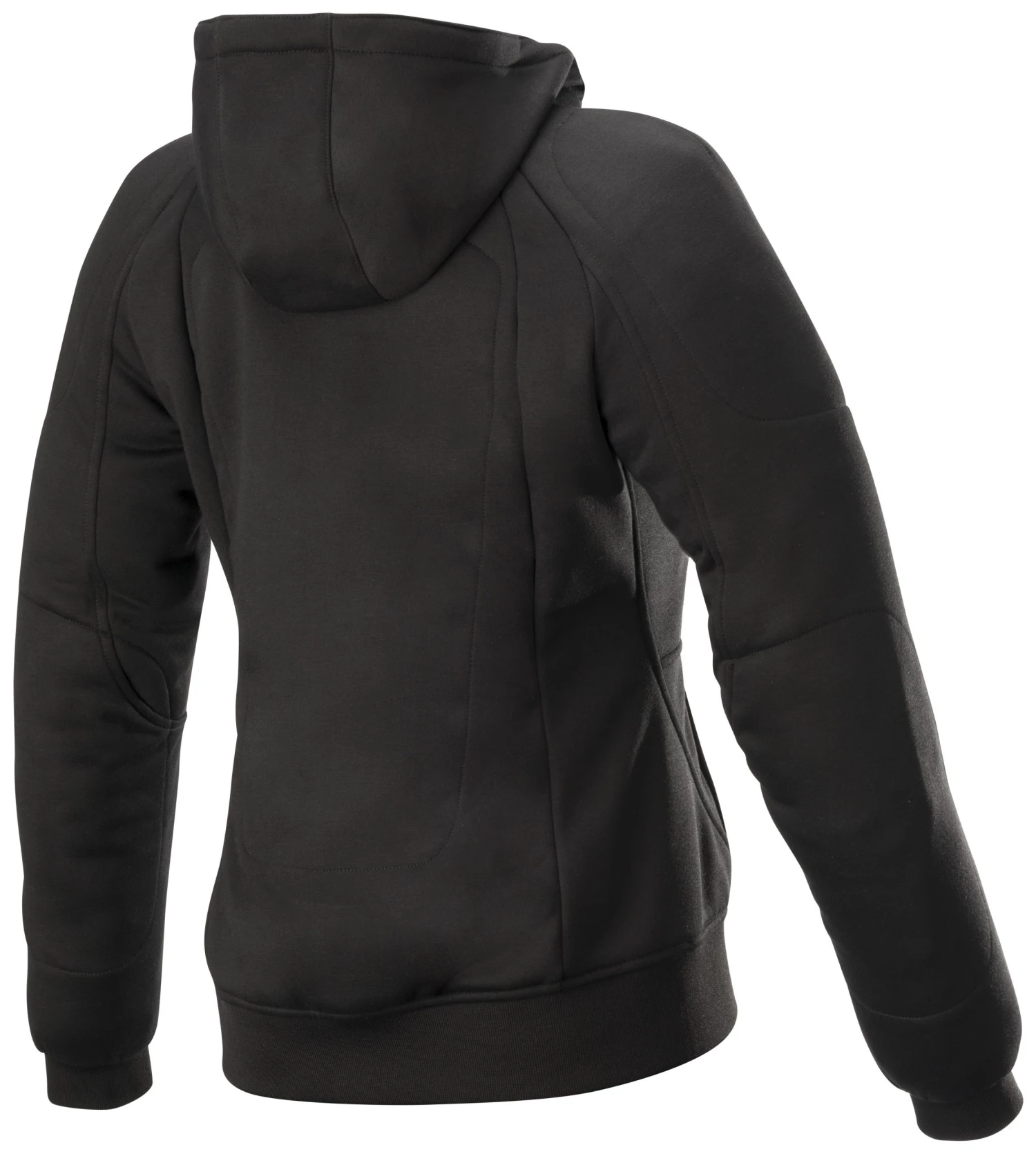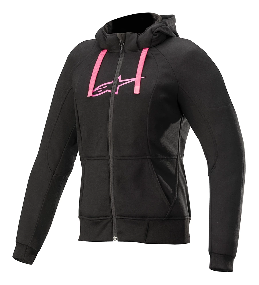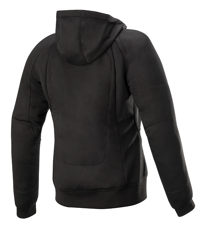 The Alpinestars Stella Chrome Sport Hoody takes the casual look of a hoodie and infuses aramid reinforcement at the elbows, shoulders and back. CE rated elbow and shoulder armor come standard, but the back armor insert is sold separately. A waterproof inner pocket is ready to house your cell phone should you forget to check the forecast and ride into rain.Â